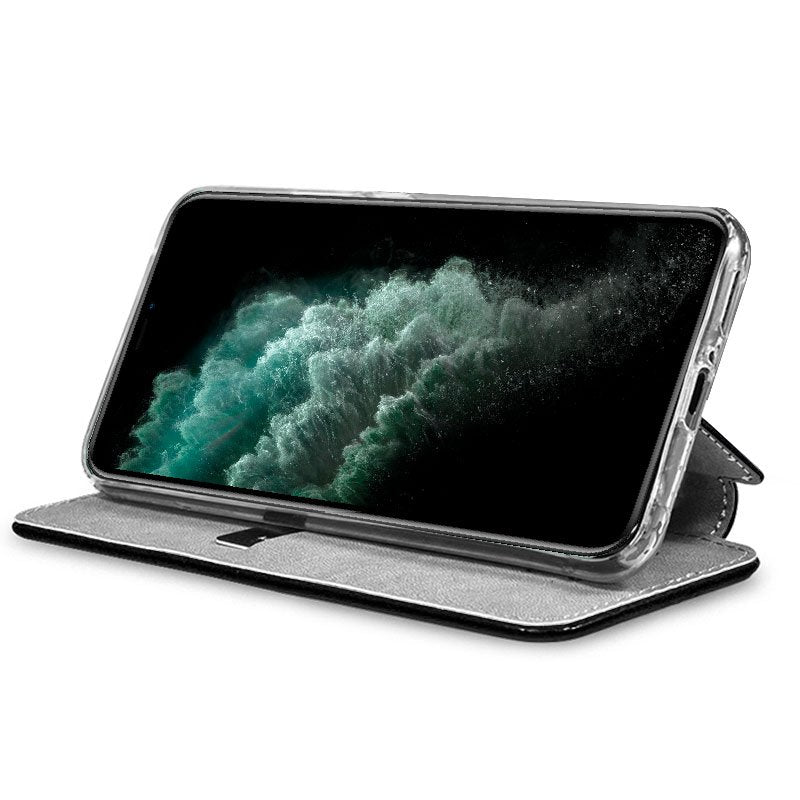 Apertura lateral tipo libro. Incorpora una carcasa específica del modelo de smartphone, para incrustarlo y dejarlo perfectamente encajado.