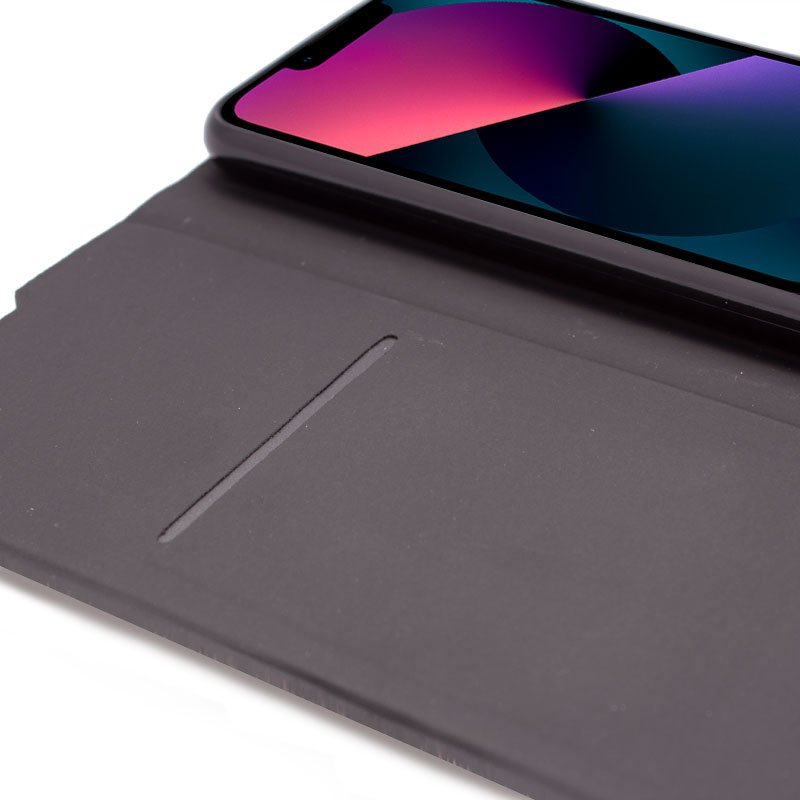 Incorpora en uno de los lados interiores, un bolsillo para meter tarjetas. También puedes mantener tu smartphone apoyado tanto de manera vertical como horizontal, para ver tus vídeos favoritos, ya que el pliegue de la funda hace de soporte.